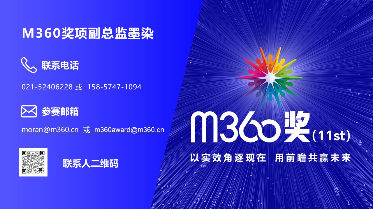 m360奖不仅在于表彰业内杰出的广告主、媒体、代理商、制作公司,更重要的是能通过m360的专业影响力、商业增长营收获利、m360的媒介回报、创新先锋性为更多的企业赋能,赢得现在与未来的生意及专业认可和丰厚回报。