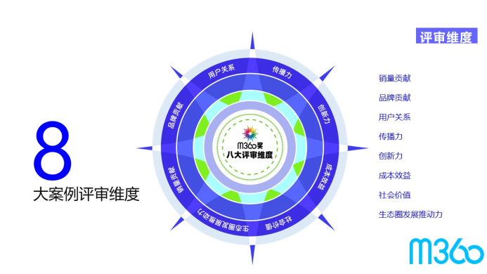 m360奖最佳实践案例的评审,评选维度包括销量贡献、品牌贡献、用户关系、传播力、创新力、成本效益、社会价值、生态圈发展推动力8大指标,360°立体、综合地从用户到品牌、从创新到效益,深入解构案例,寻求中国真正对营销及传媒有推动和发展的好案例。