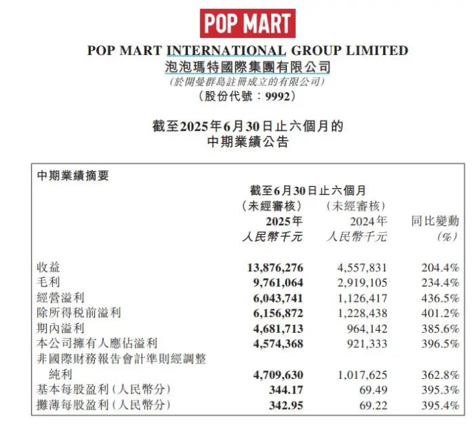 在全球消费市场增长乏力的背景下,泡泡玛特2025年上半年业绩却呈现爆炸式增长——营收同比增长204.4%至138.8亿元,净利润更是飙升362.8%至47.1亿元,这一成绩甚至超越了2024年全年表现。