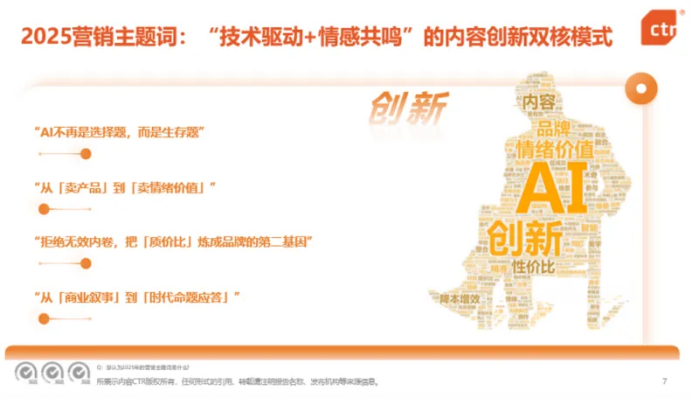 根据CTR《2025中国广告主营销趋势调查报告》,2025年广告主最为关注的TOP5营销关键词,涵盖AI、创新、情绪价值、内容、品牌等。广告主越来越注重AI技术驱动与情绪价值共鸣的内容营销创新,紧跟最新营销风口,以撬动增长更大的可能性。