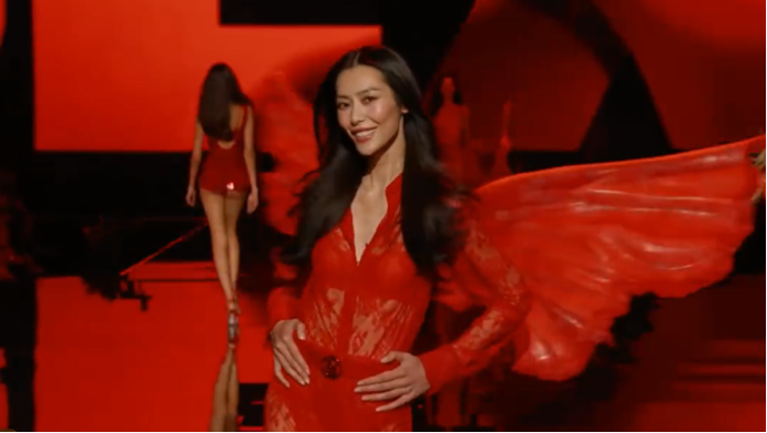 中国超模刘雯身着红色蕾丝套装,搭配红色翅膀亮相,成为全场的焦点之一。值得注意的是,这是刘雯第9次登上维密舞台,打破了亚洲模特的纪录,彰显了其在国际时尚界的持久影响力。